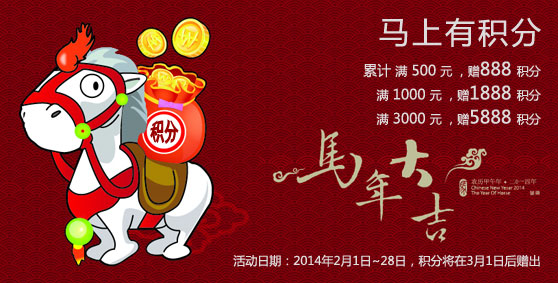 •   金蛇已离去,玉马腾空来,旗客办公商城祝您新年愉快,阖家幸福,万事如意,步步高升,值此新春佳节之际,凡在2月1日至2月28日之间,采购累计达一定金额的会员将会获得额外积分奖励,具体如下: