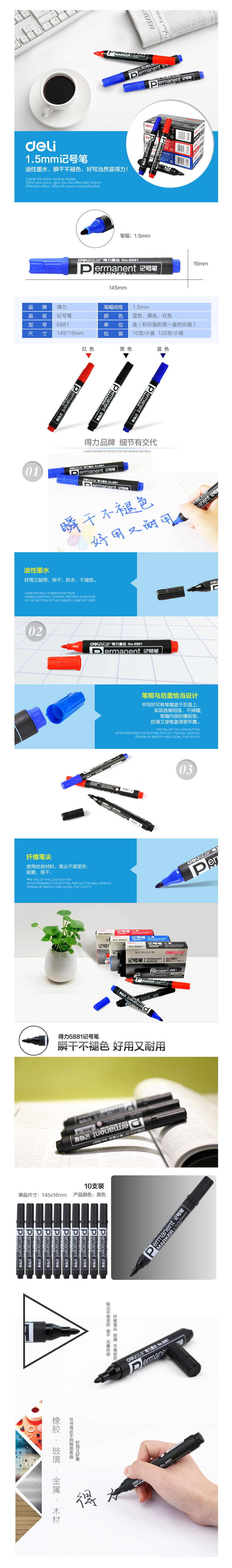 品名:得力(deli) 经典实用记号笔 6881 单头 10支/盒 黑色