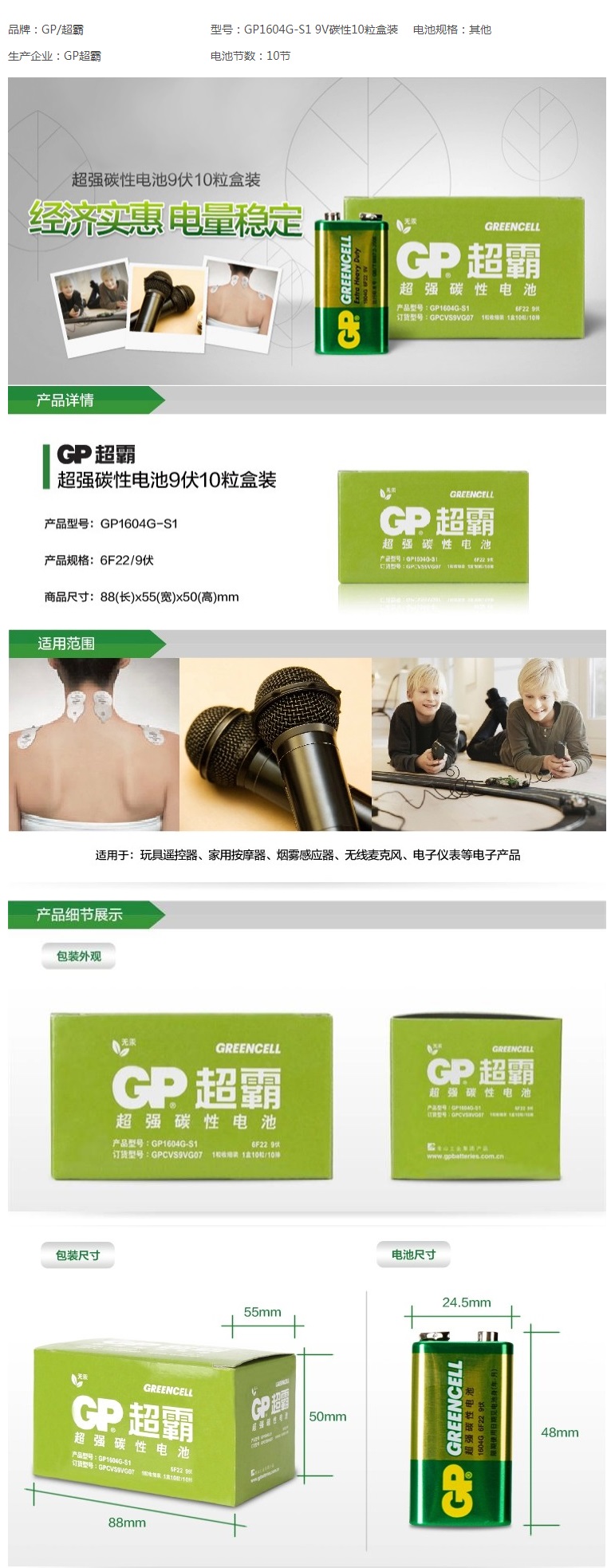 品名:超霸 电池 1604G 高性能碳性 9V