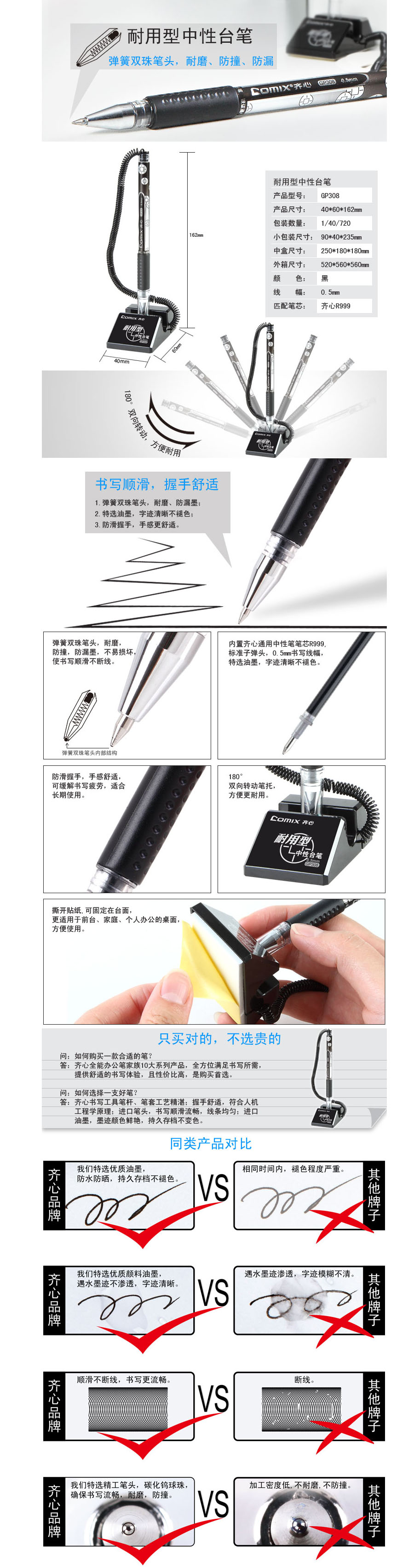 齐心(Comix) 耐用型台笔 GP308 35*45*160mm 书写粗细: 0.5mm 20g/支