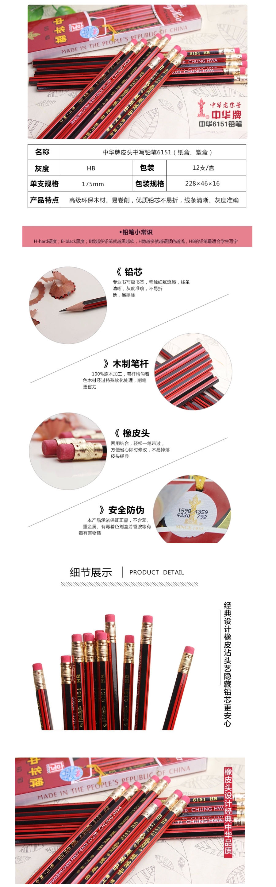 品名:中华 橡皮铅笔 6151 HB 木质 橡皮头12支装