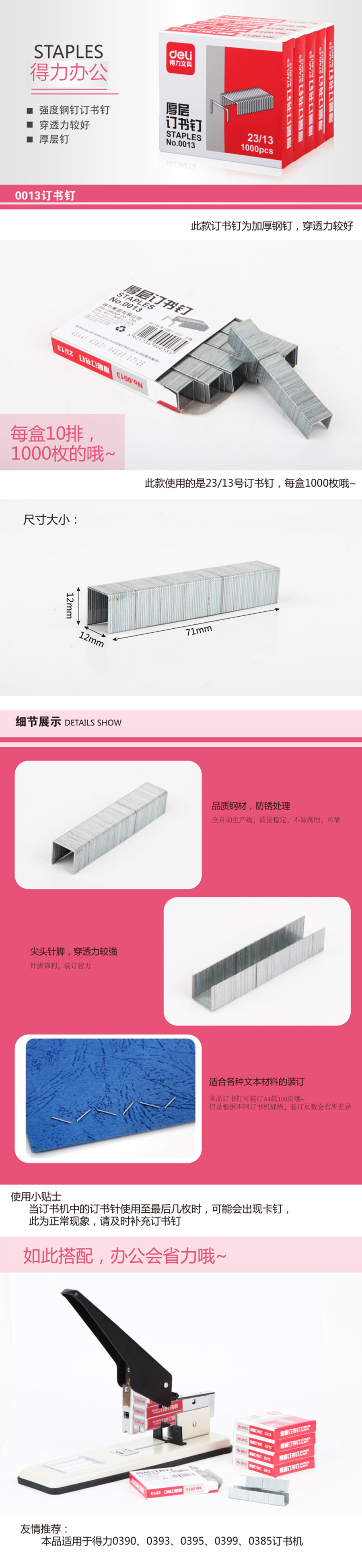 品名:得力(deli) 厚层订书钉 0013 23/13 1000只/盒 可订约100页