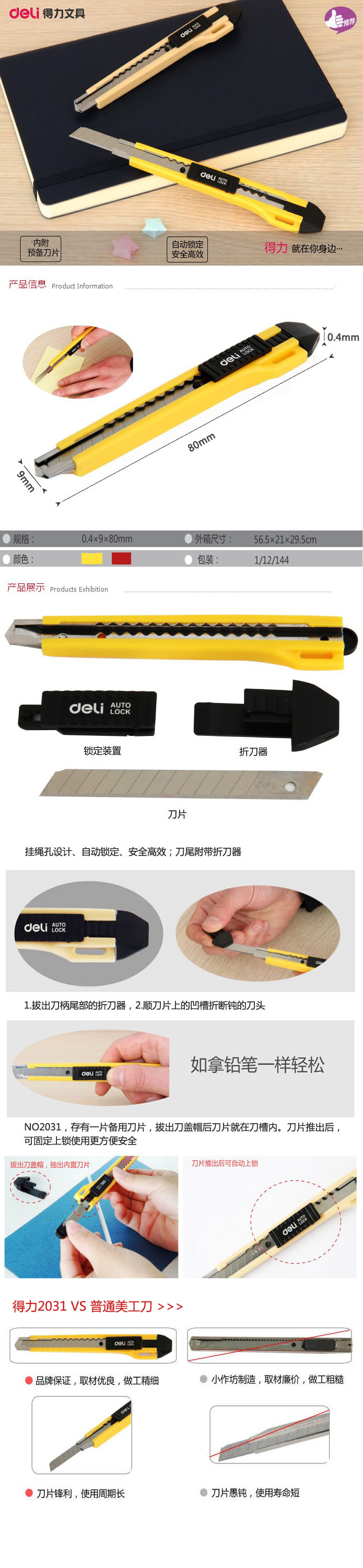 【特点】挂绳孔设计,拔出刀柄尾部的折刀器,顺刀片上的凹槽折断钝的刀头,尾部附带折刀器