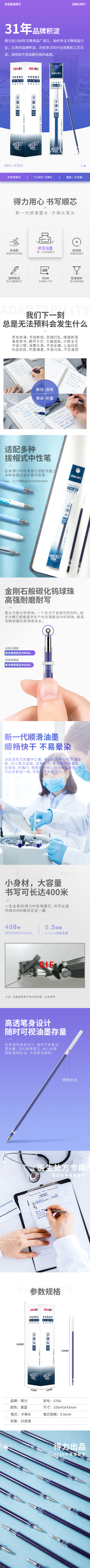品名:得力(deli) 中性笔芯0.5 S760 0.5mm 蓝色 20支/盒