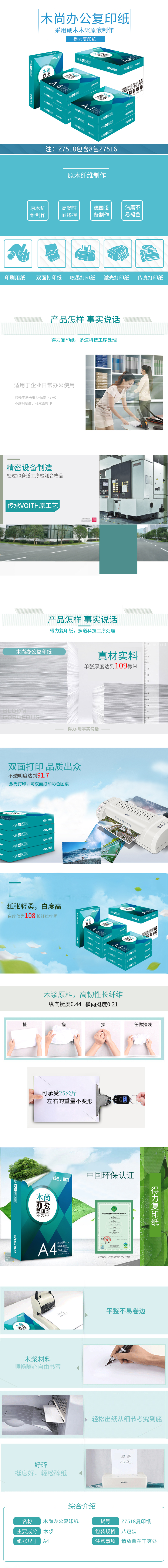 品名:得力(deli) 打印纸 Z7518 木尚 A4 80g 8包装 /箱 500张/包