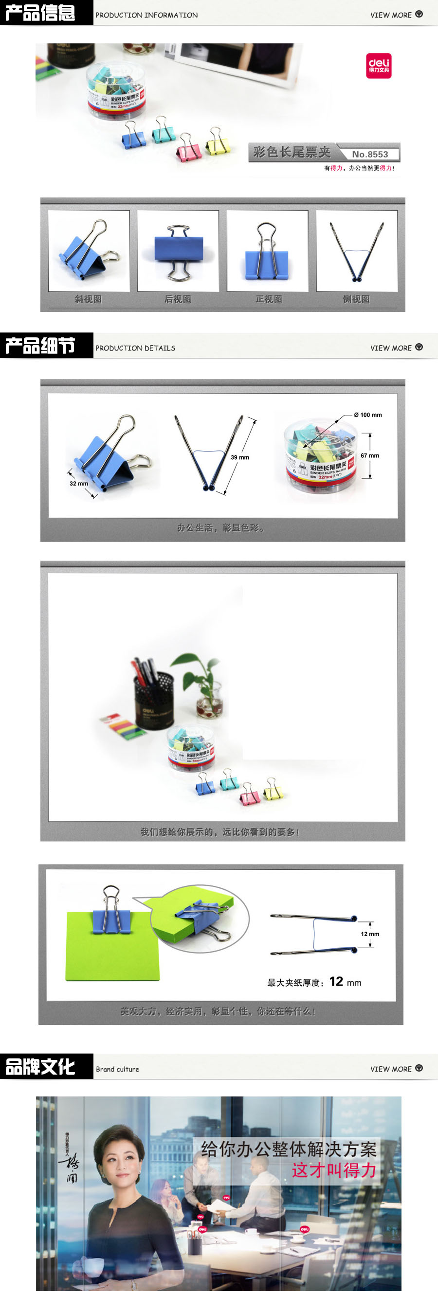 品名:得力(deli) 长尾票夹 8553 32mm 24只/筒 彩色