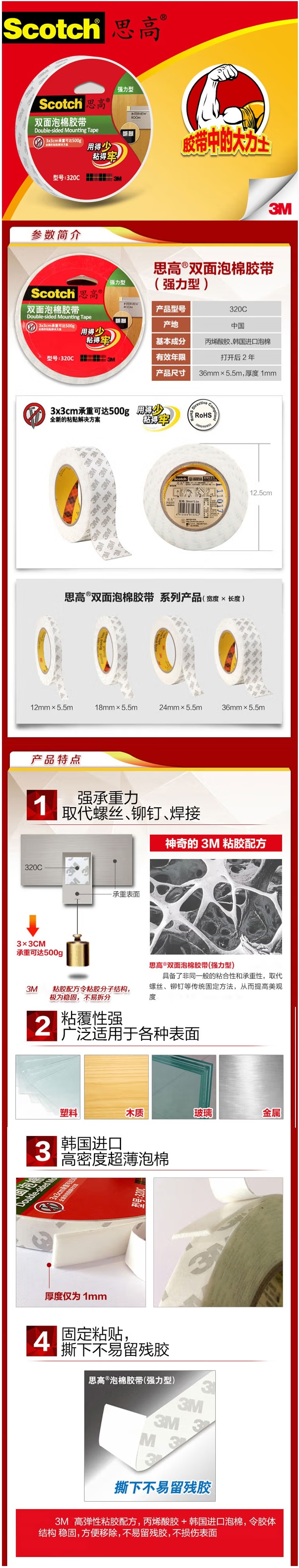 品名:3M 双面胶带 320C 思高 泡沫 海绵 泡棉 12mm*5.5m*1mm 单卷