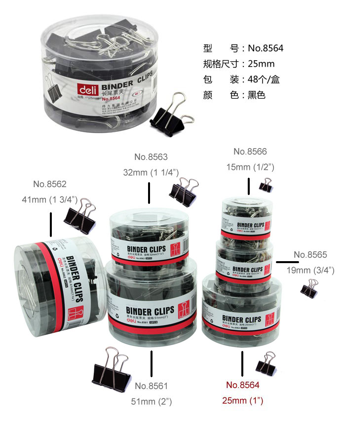 品名:得力 黑色长尾票夹(筒装) 8564 25mm 48只装