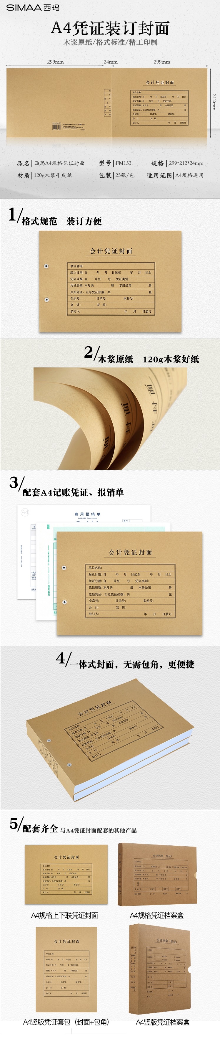 西玛(SIMAA) 会计凭证封面 FM153 299*212*24mm A4 带脊背 120g 一体式 25张/包