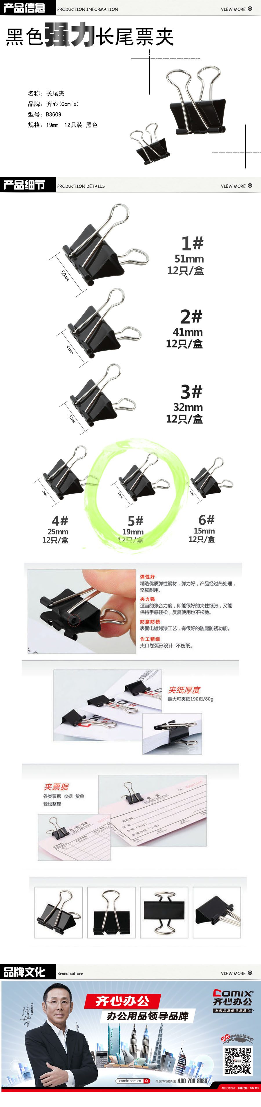 品名:齐心(Comix) 长尾夹 B3609 19mm 12只装 黑色