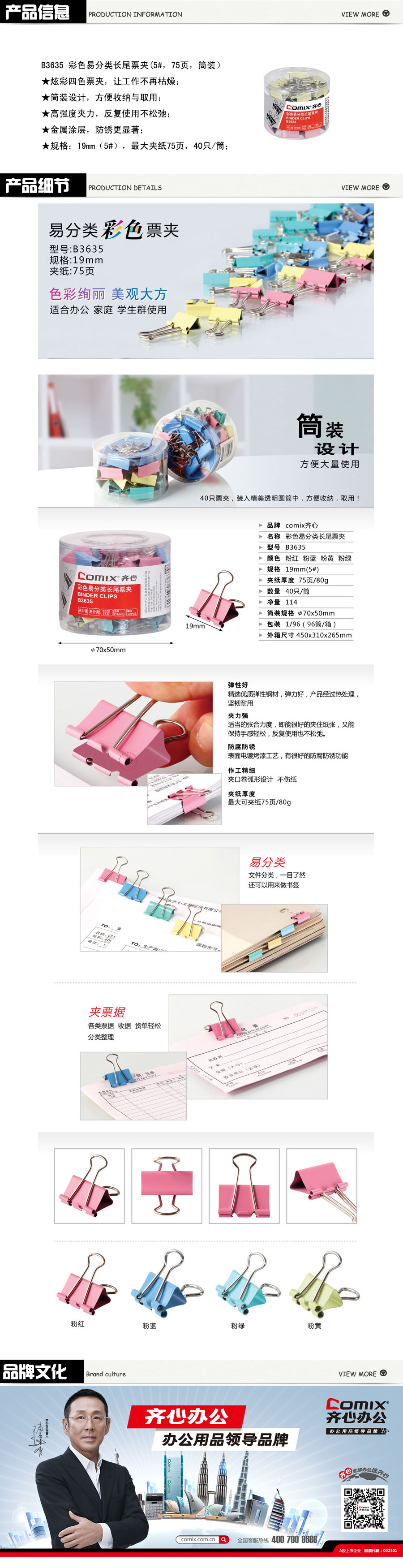 品名:齐心(Comix) 易分类长尾票夹 B3635 19mm 40只/筒 彩色