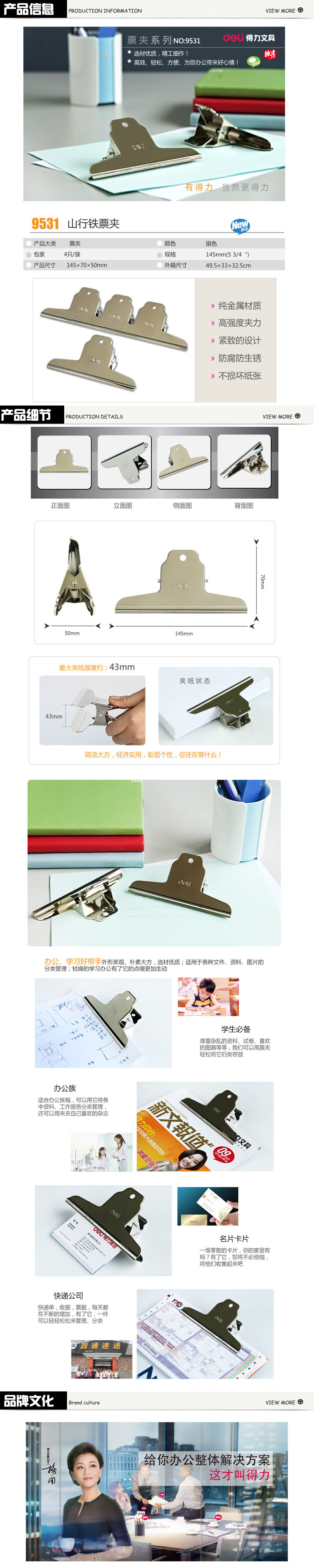 品名:得力(deli) 山形铁票夹 9531 145mm 4只/袋