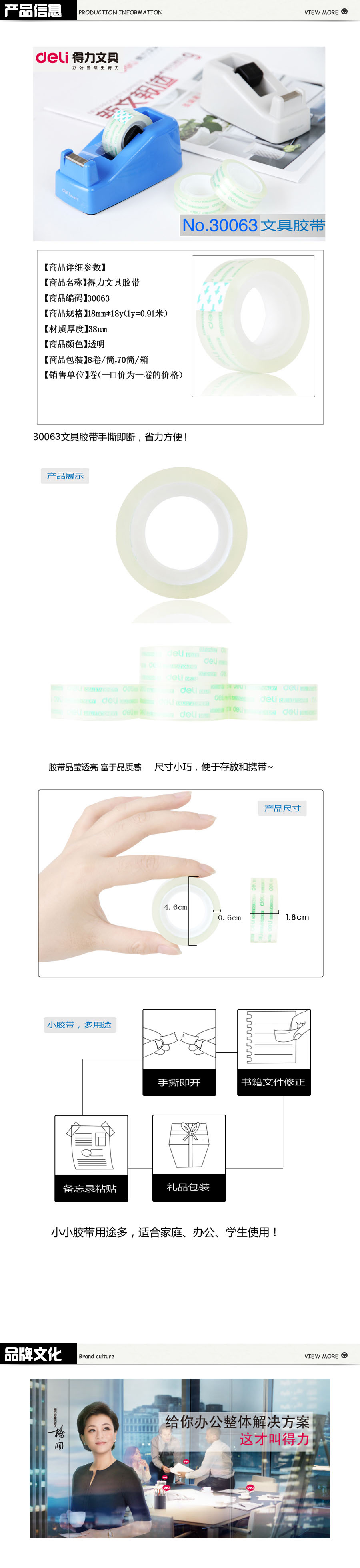 品名:得力(deli) 文具胶带 30063 18mm×18y×38um