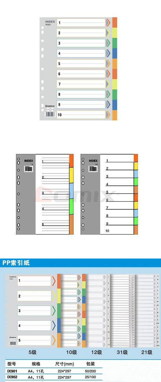 品名:齐心(Comix) 彩色分类索引纸 IX902 A4 10页 11孔