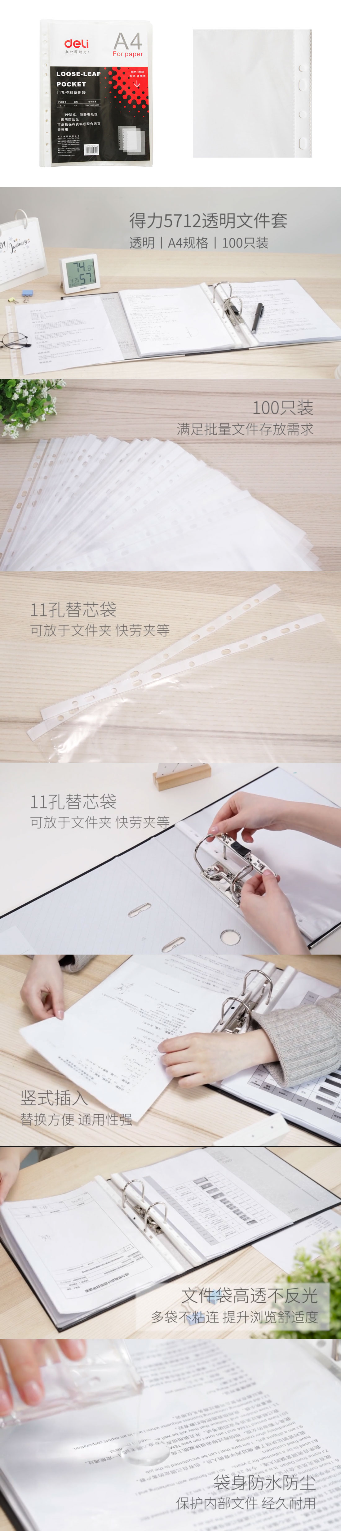 品名:得力(deli) 资料备用袋 5712 A4 透明 11孔 100只/包