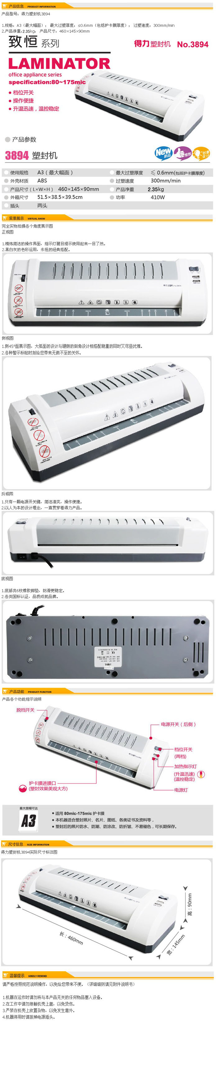 品名:得力(deli) 塑封机 3894 银灰 A3 2.35kg