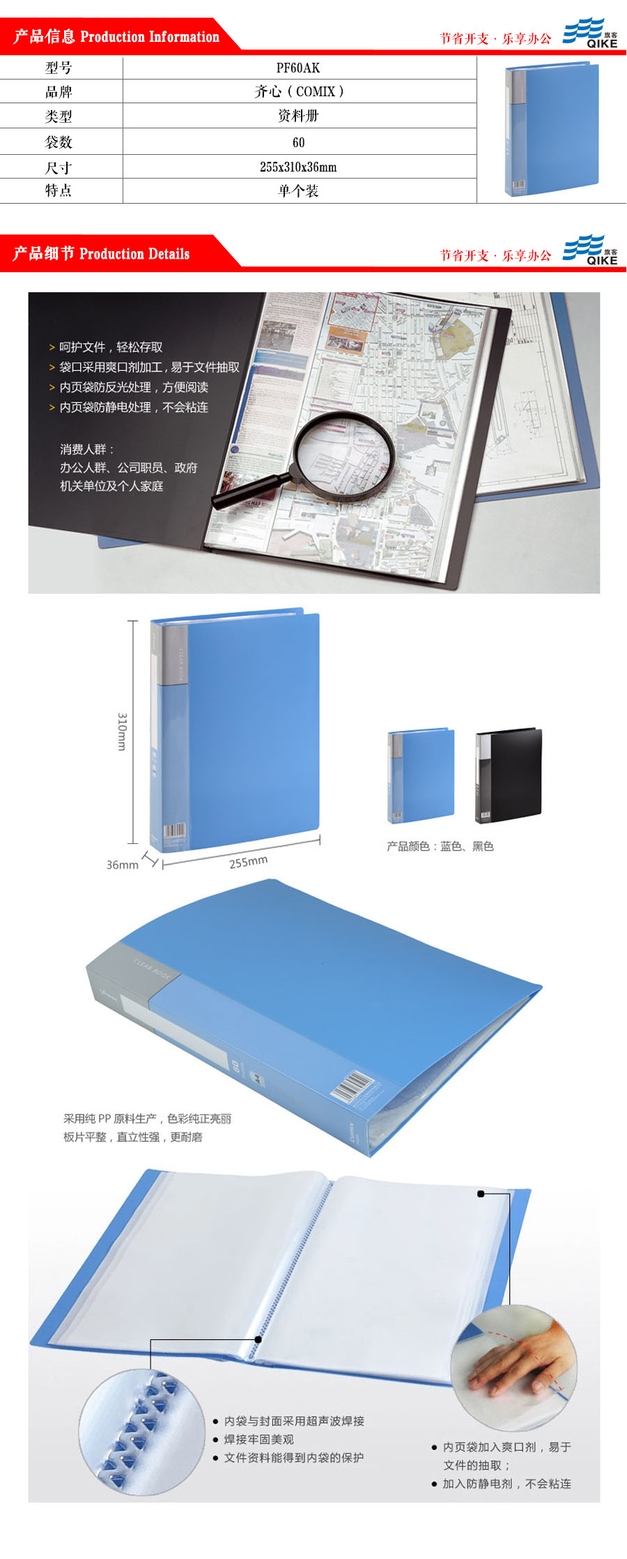 品名:齐心(Comix) 资料册 PF60AK A4 310*255*36mm 60页