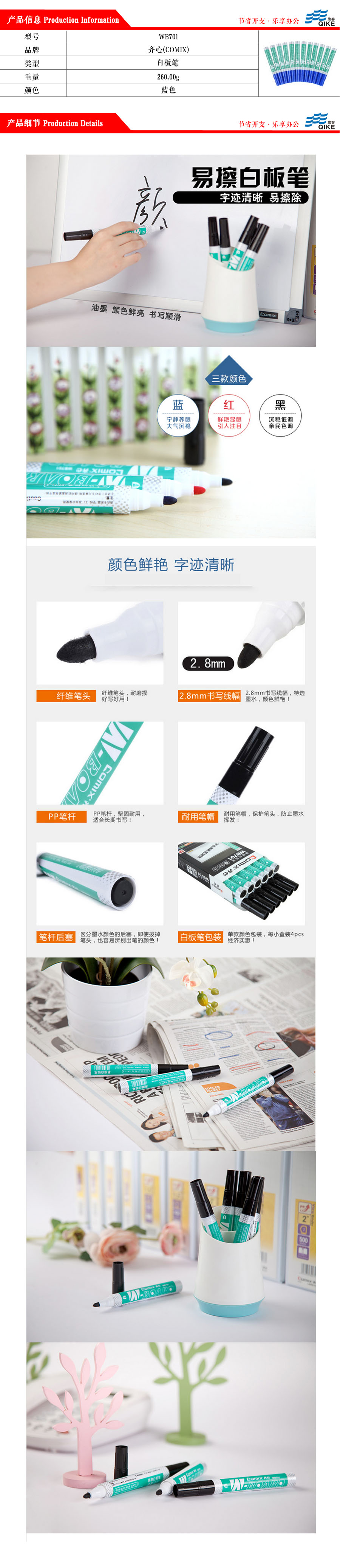 品名:齐心(COMIX) 易擦白板笔 WB701 2.8mm 12支/盒 蓝色
