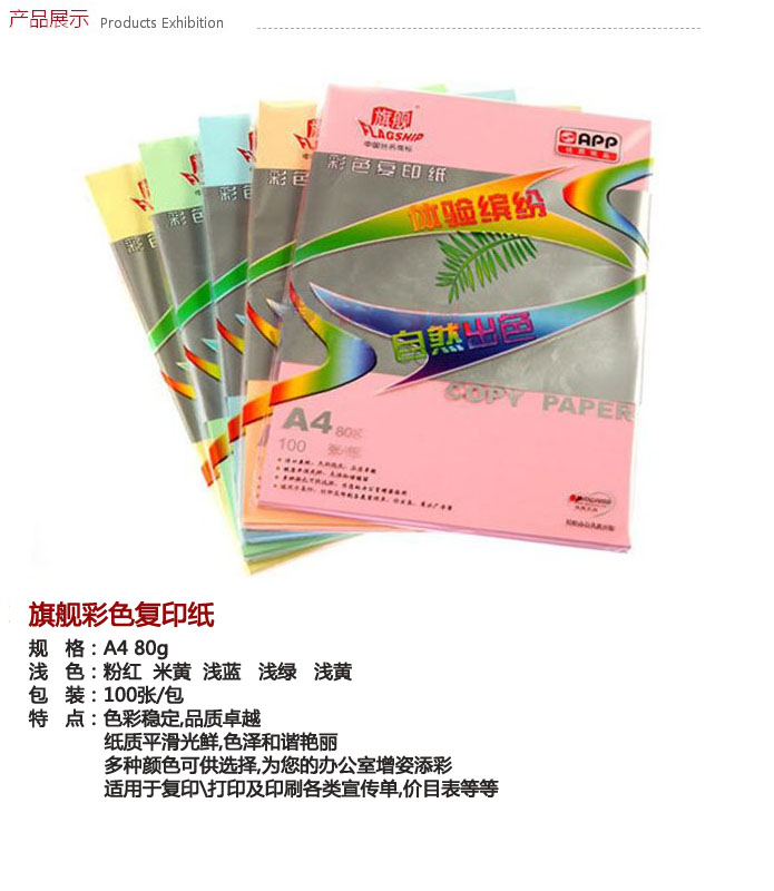 品名:旗舰 彩色复印纸(浅色) 2000 80g A4 100张/包