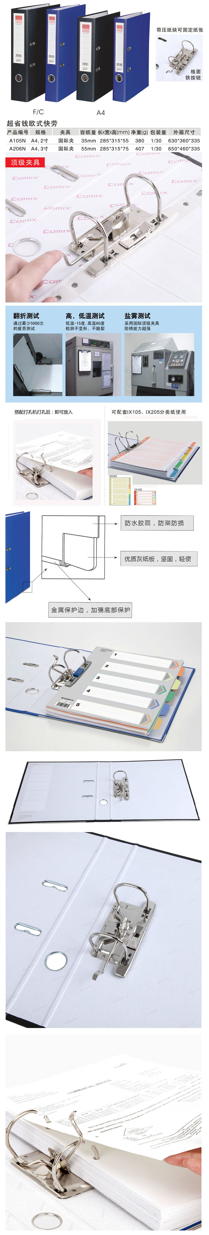 【商品简介:】 材料:再生纸板芯 容纸量:55mm 尺寸:285*315*75mm夹具操作方便,可以轻松地进行文件储存功能:(1)文件的保管、保存,方便查阅; (2)2孔夹,杠杆原理,可以轻松地进行文件储存; (3)金属护边条保证产品经久耐用、指环方便拿取、固定扣锁定文件夹压纸板固定文件; (4)附送五色索引纸; (5)背脊标签纸双面印刷