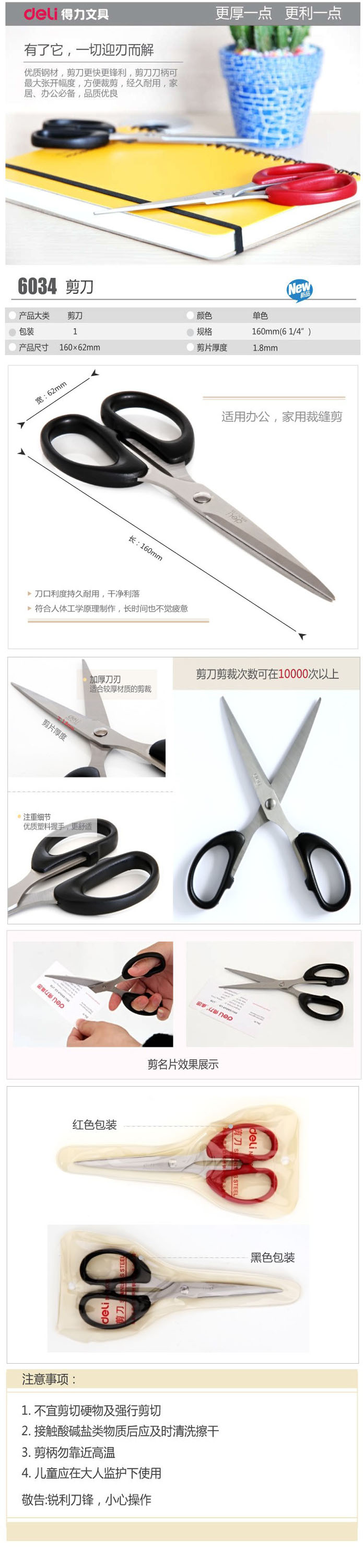 品名:得力(deli) 剪刀 6034 160*62mm 61/4 黑色 红色 颜色随机