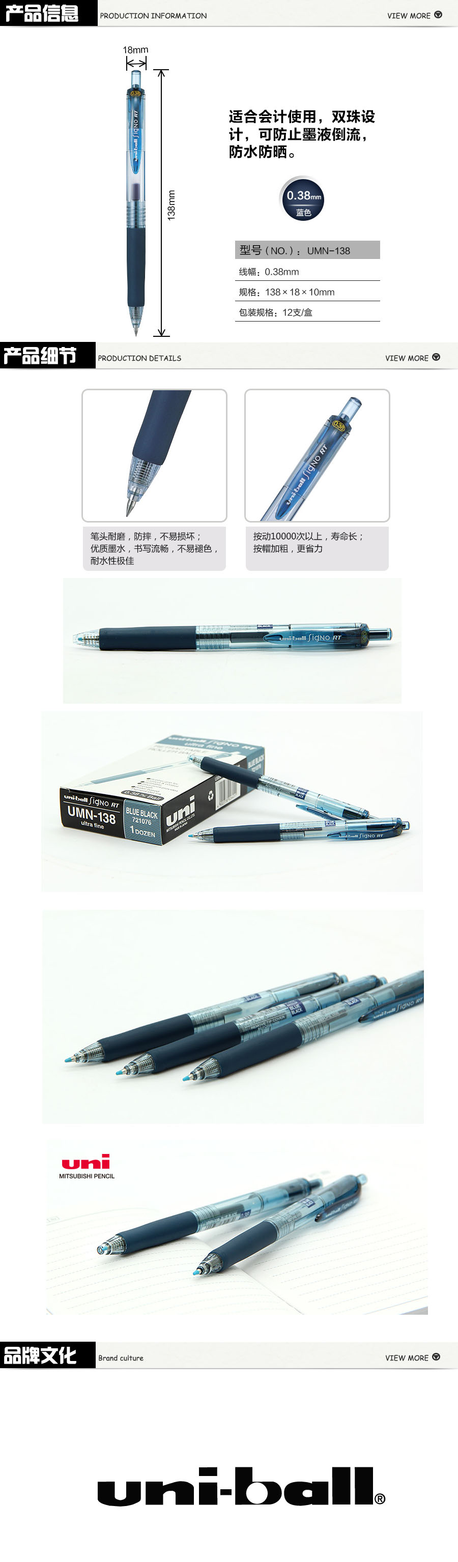 品名:三菱(Uni) 按制中性笔 UMN-138 0.38mm 12支/盒 墨蓝色