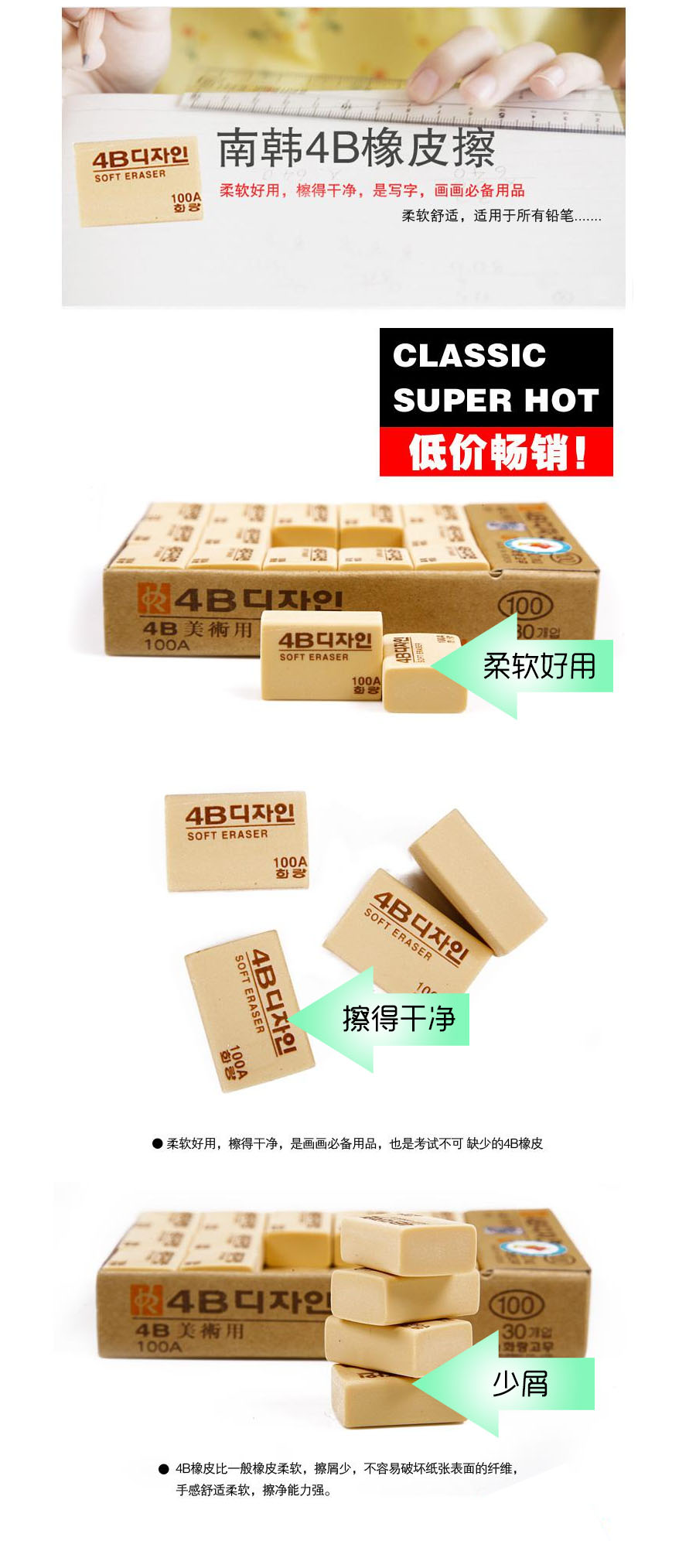 【特点】柔软好用,擦得干净,是画画必备用品,也是考试不可缺少的4B橡皮。