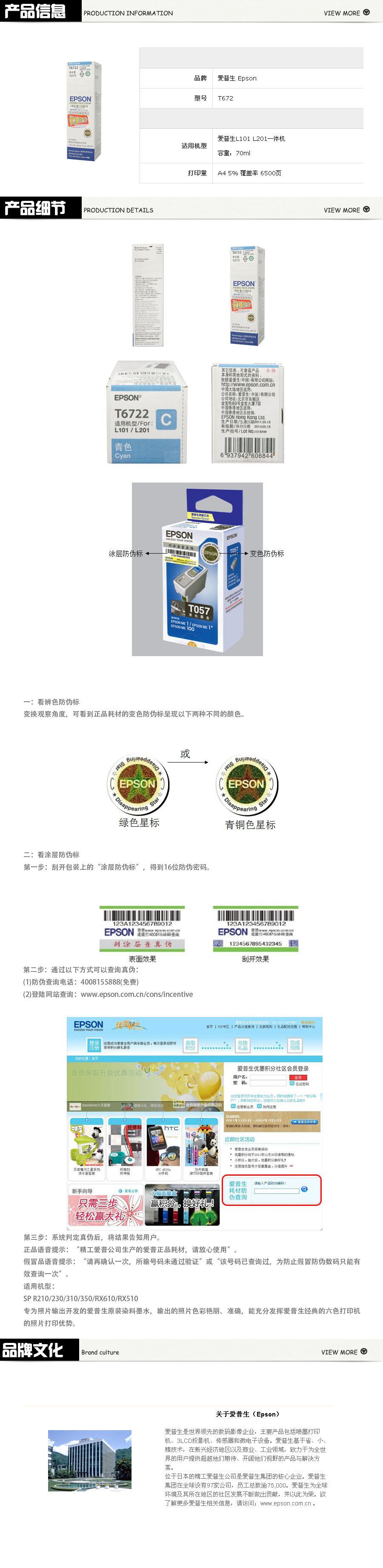 品名:爱普生(Epson) 墨水补充装 T6722(C13T672280) (适用L101/L201)青色