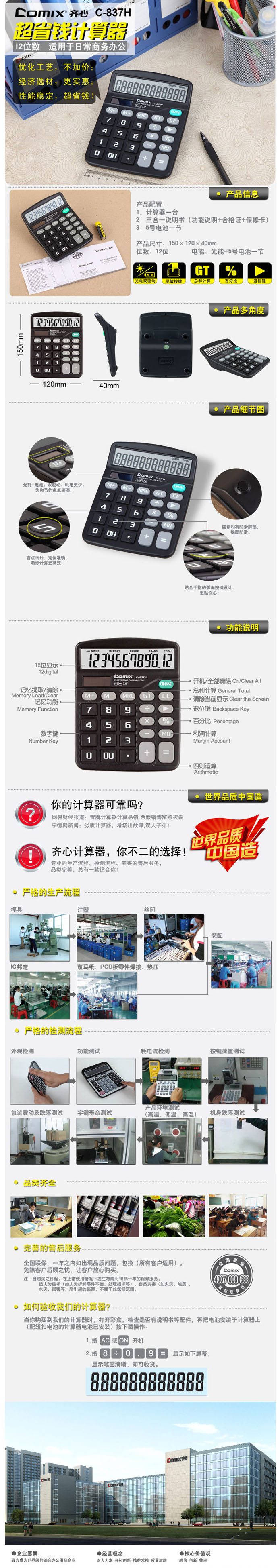 【名称】超省钱计算器【品牌】齐心(Comix)【型号】C-837H【规格】150*120*40mm 125g★ 经典外观造型★ 12位超大高清显示屏幕★ 舒适灵敏按键★ 双重电源,使用更持久★ 总和计算、退位键、记忆功能、利润计算