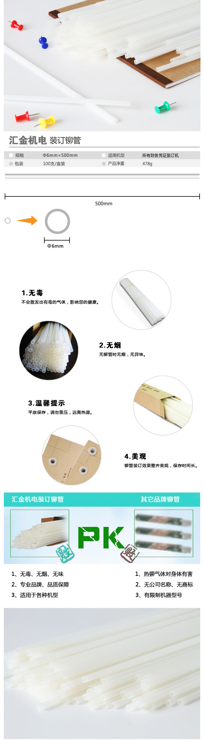 品名:汇金机电 原装进口高分子尼龙(聚酰胺) 财务档案装订机专用 铆管 100根/盒...