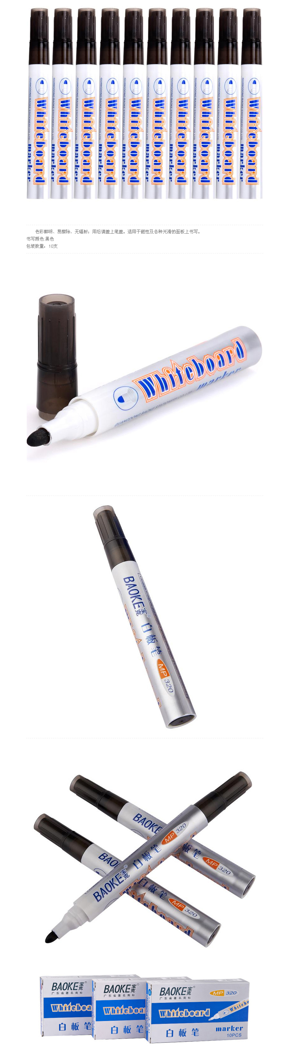 品名:宝克(BAOKE) 白板笔 MP320 单头 可擦水性 10支/盒 黑色