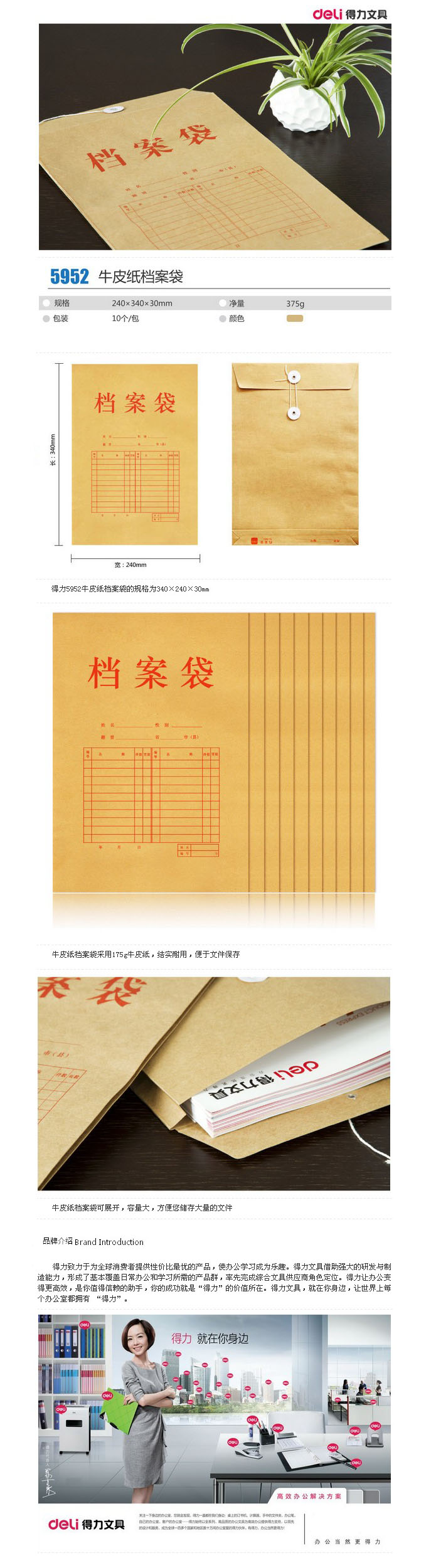 品名:得力 deli 牛皮纸档案袋 5952 240*340*30mm