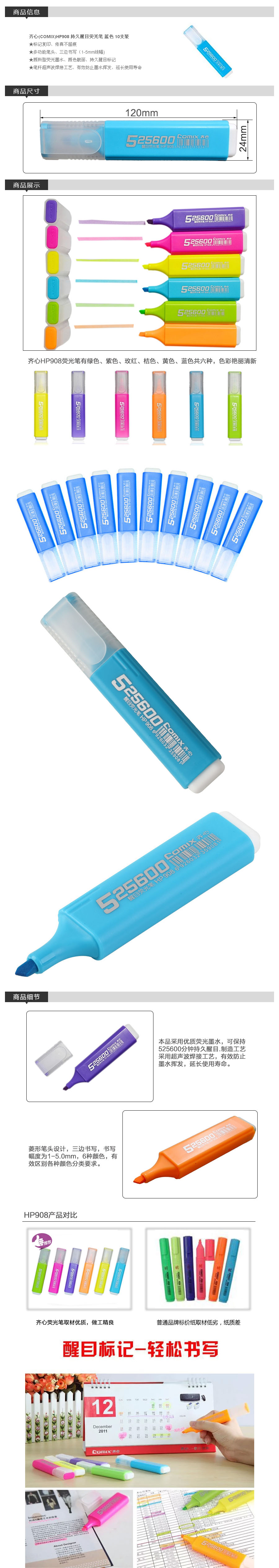 品名:齐心(Comix) 持久醒目荧光笔 HP908 18g/支 10支/盒 蓝色