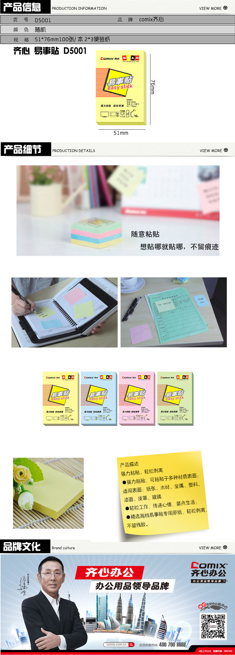 品名:齐心(Comix) 易事贴 D5001 51*76mm100张/ 本 2*3便签纸