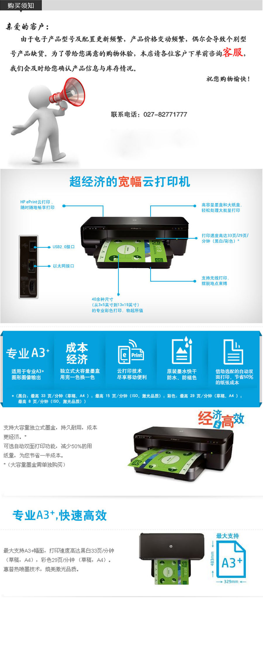 品名:惠普(HP) 彩色喷墨打印机 Officejet 7110 打印 A3 双面 手动 分体式墨盒
