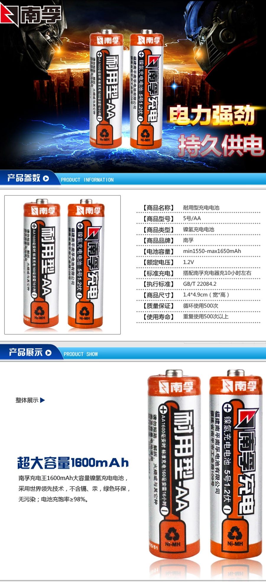 品名:南孚(NANFU) 镍氢充电电池 AA-2B 1600mAh 2粒 5号