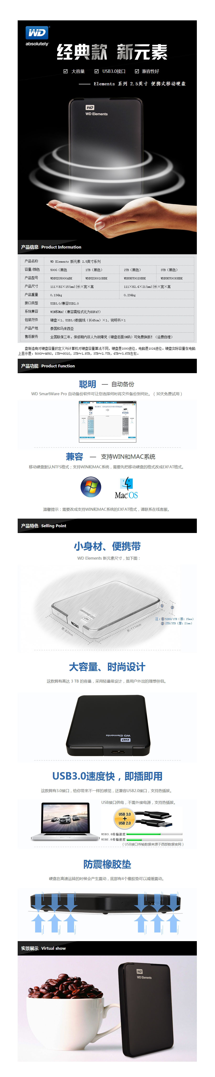 规格:Elements 新元素系列 2.5英寸 2TB USB3.0
