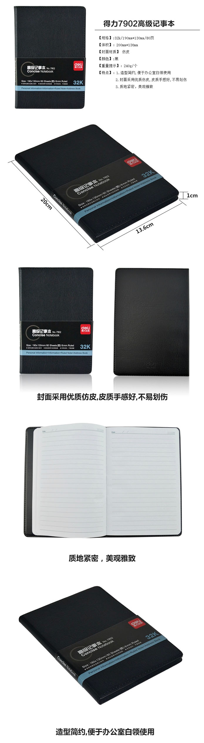 品名:得力(deli) 高级记事本 7902 仿皮 32K 190*130mm 80页 黑色