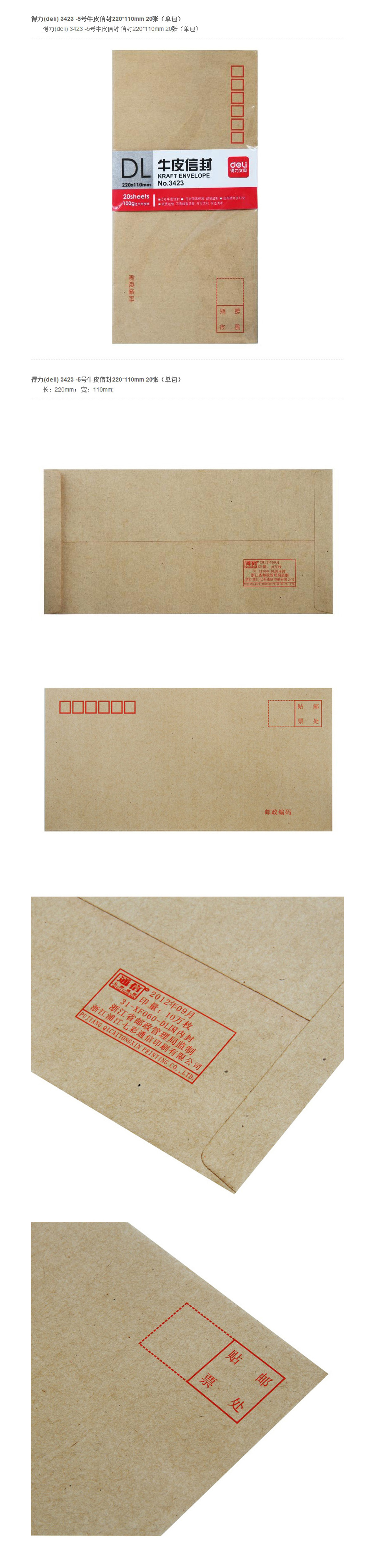 品名:得力(deli) 牛皮信封 3423 220*110mm 20张 单包