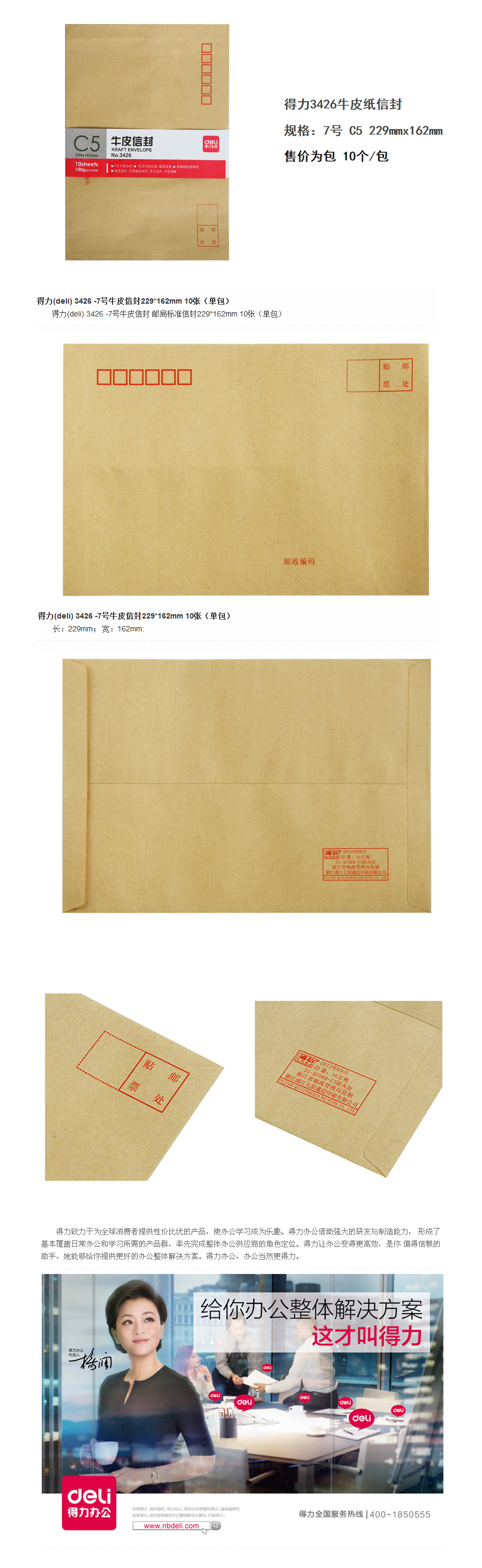 品名:得力(deli) 牛皮信封 3426 229*162mm 10张 单包