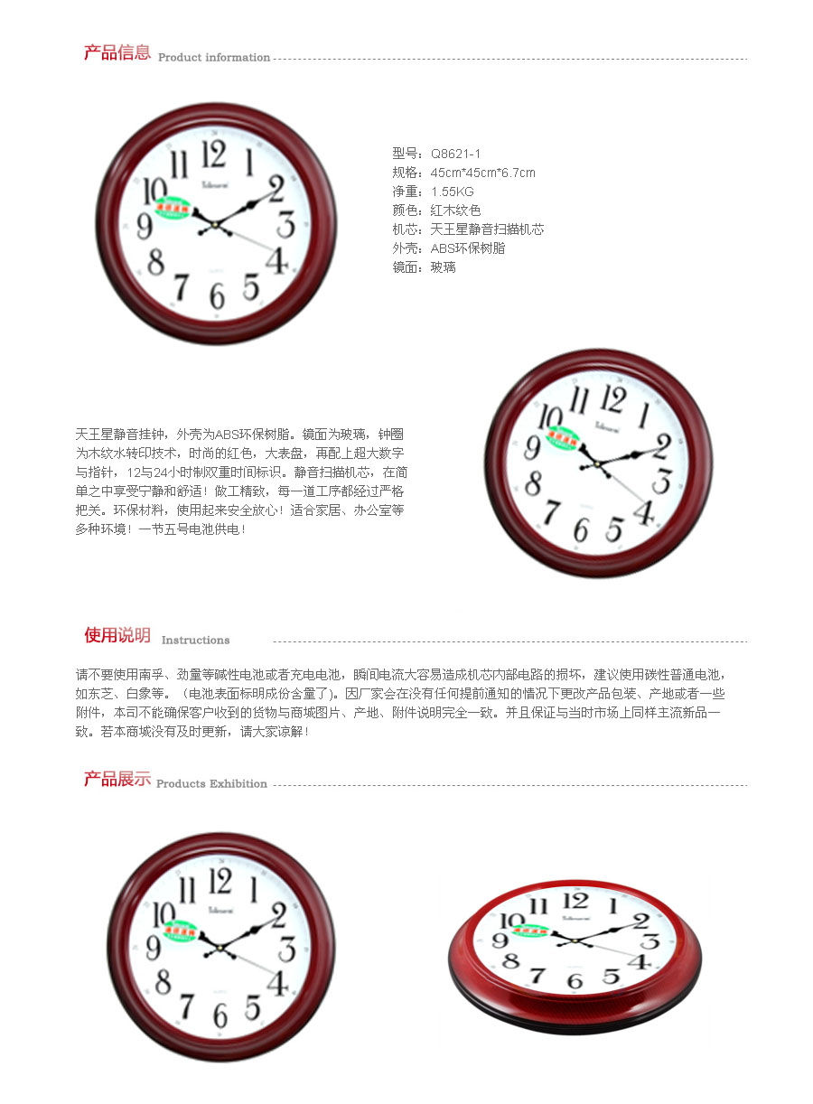 品名:天王星(Telesonic) 挂钟 Q8621-1 红木纹色 17英寸