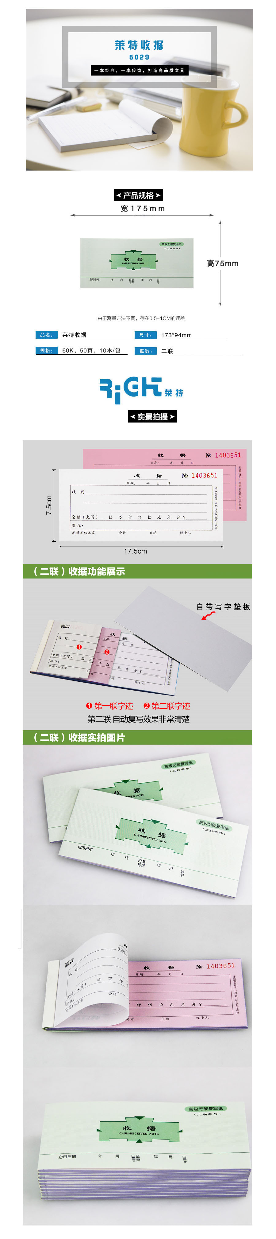 品名:莱特 收据 5029 二联无碳复写纸 76×172mm 50页