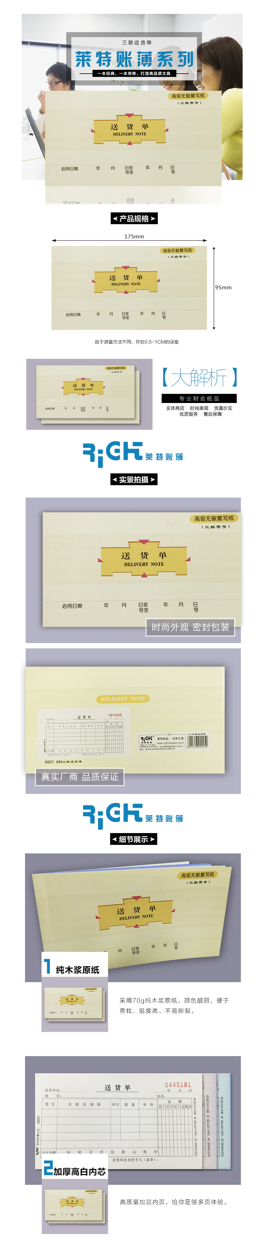 品名:莱特 送货单 5007 三联 9.5×17.5cm 60页 20份