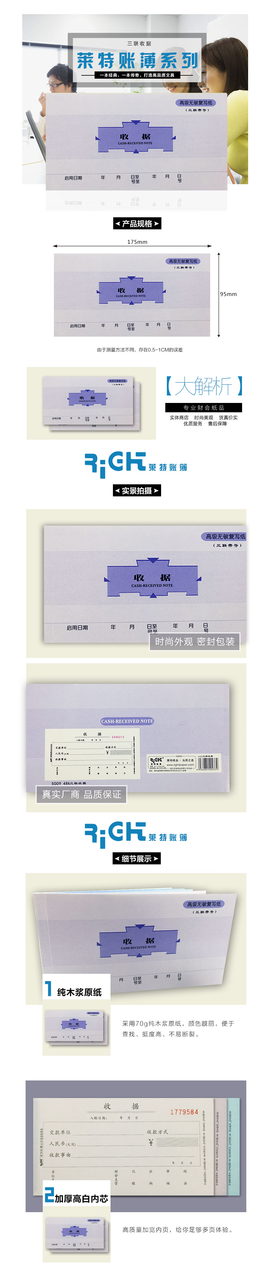 品名:莱特 收据 5009 高级无碳复写三联 95×175mm 60页 20份