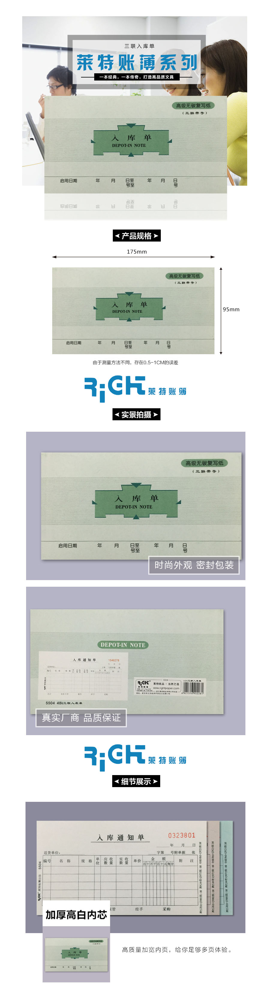 品名:莱特 入库单 5504 三联无碳复写纸 95×175mm 60页