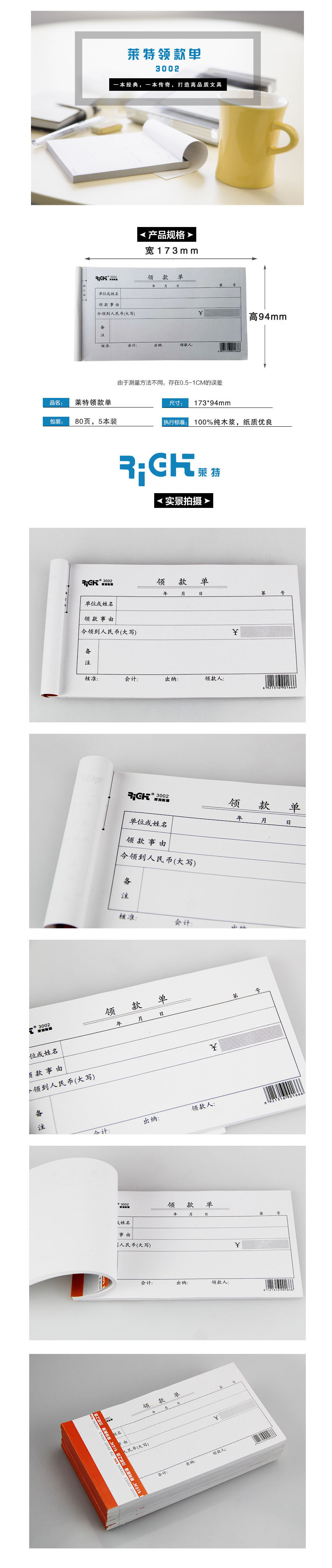 品名:莱特 领款单 3002 48开 75×95mm 100页