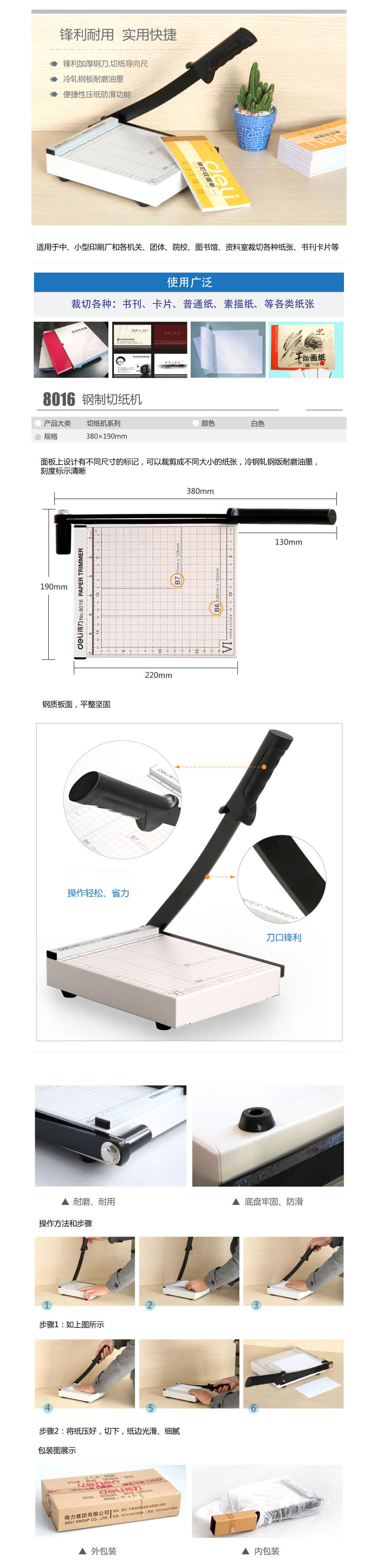 规格:380×190mm ;材质:优质冷轧钢板耐磨油墨,锋利加厚钢刀切纸导向尺便捷性压纸防滑功能;颜色:白色 ;包装:彩盒包装