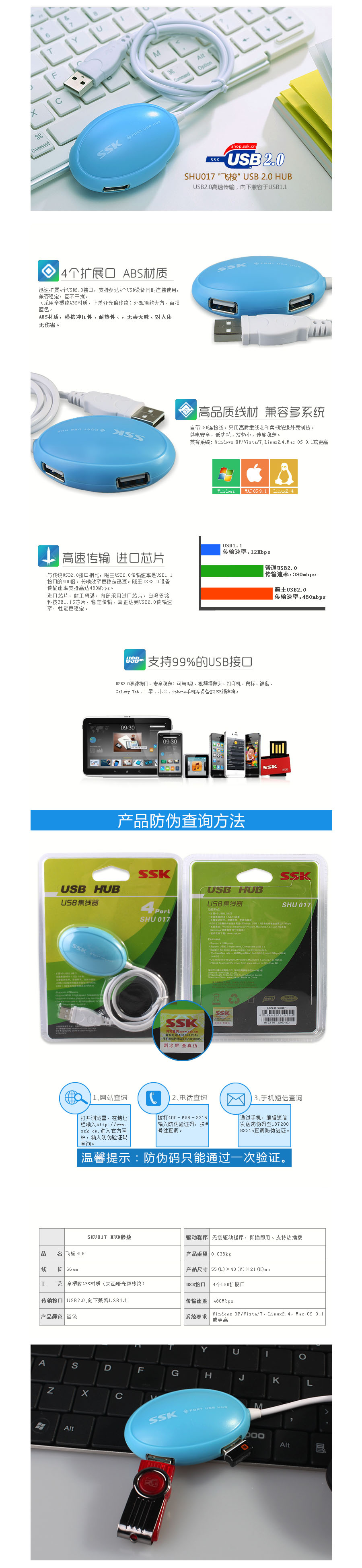 品名:飚王(SSK) 4口飞梭集线器HUB SHU017 蓝色
