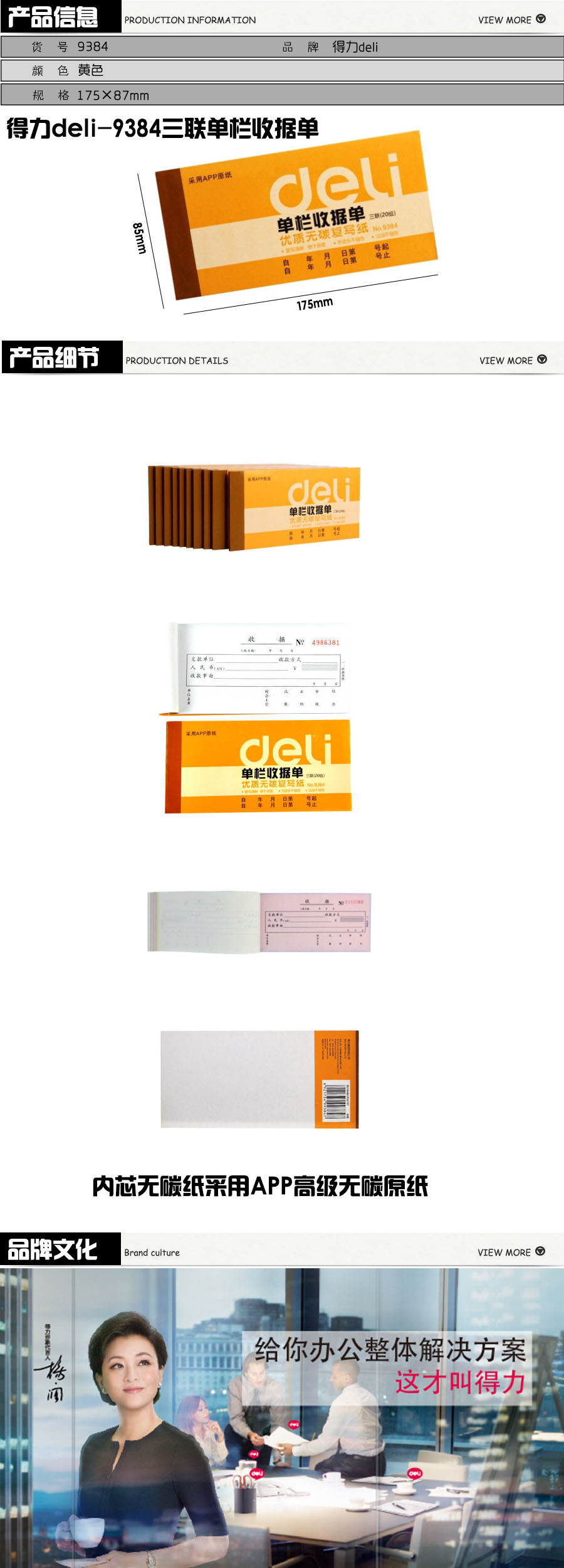 品名:得力(deli) 单栏收据单 9384 三联无碳复写纸 175×87mm 60页