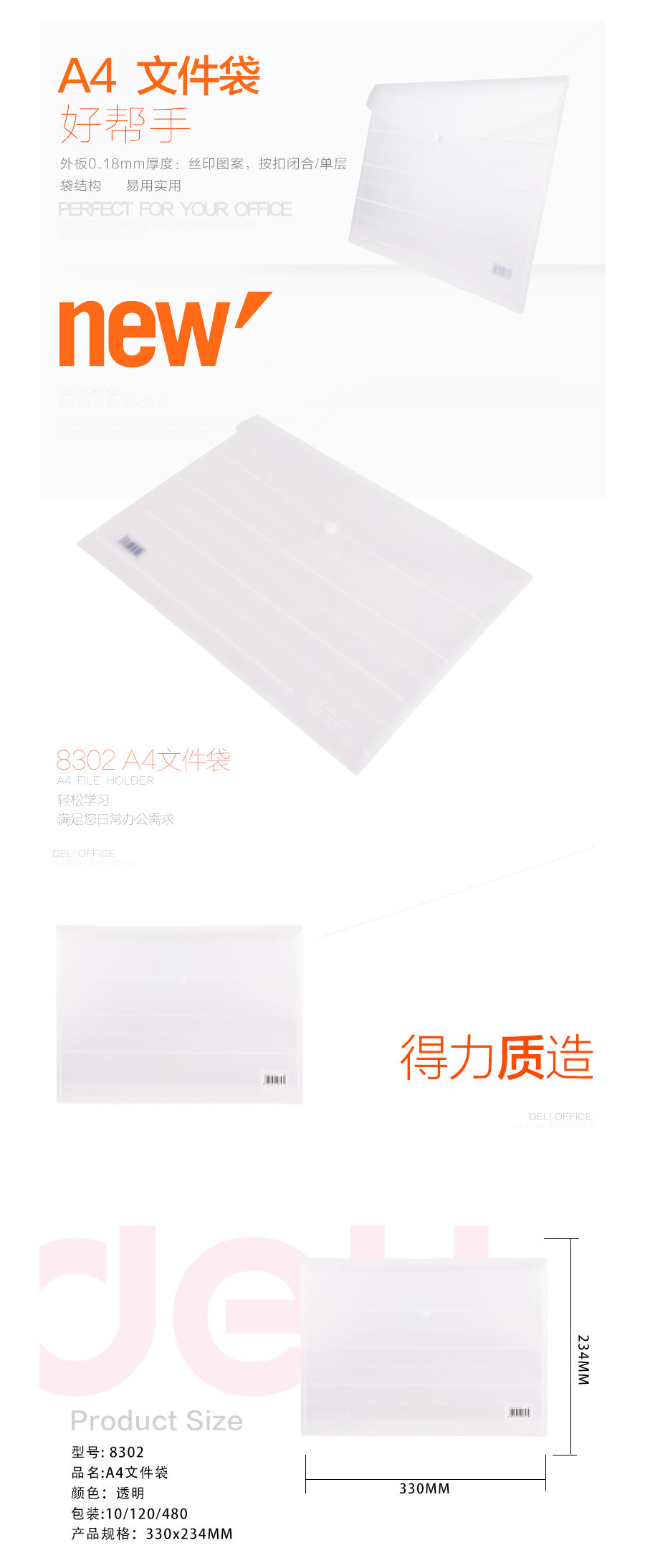 品名:得力(deli) 文件袋 8302 直纹磨砂 透明 A4 10个/包